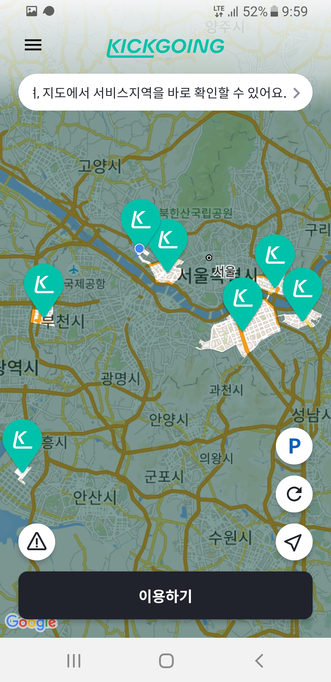 현재 킥고잉 서비스지역으로는 서울시 강남구, 서초구, 송파구, 광진구, 성동구, 마포구, 서대문구, 경기도 부천시, 시흥시에서 운영되고 있습니다. 시행 초기에 비해 서비스 지역이 많이 늘어났지만 부산 센텀시티같은 경우 한때 킥고잉 운영을 했다가 현재는 중단된 상태로 서비스 지역은 언제든 확장되거나 축소될 가능성이 있다는 점 참고해주시면 좋겠습니다.