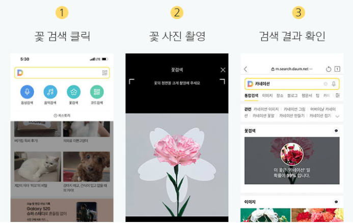 꽃 검색 방법은 다음 앱에서 검색창 하단 '꽃검색' 버튼을 클릭하여 카메라 앱을 실행시키고 이름을 알고자 하는 꽃 사진을 촬영합니다. 그러면 국내에서 주로 피는 400여종의 꽃 정보가 포함된 빅데이터에서 딥러닝 기술을 기반으로 꽃이름을 찾아내서 보여주게 됩니다.