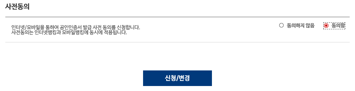 로그인을 한 다음 공인인증센터 > 인증서발급사전동의 메뉴로 이동해 동의신청을 해주시구요.