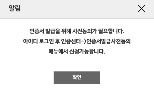 처음 발급 버튼을 누르면 아래처럼 발급 전에 사전동의 과정이 필요하다고 보여주는데, 확인 버튼을 누른 뒤 다시 홈페이지로 이동 해서 아이디 로그인을 먼저 해주셔야 합니다. 그리고 인증센터 > 인증서발급 사전 동의 메뉴로 들어가서 신청을 해주시구요. 만약 아이디가 없으시다면 회원가입을 통해 아이디를 먼저 만드셔야 합니다.