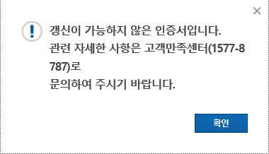 최근 유효기간이 다가와서 공인인증서 갱신을 하려고 인증센터에 접속하니 아래처럼 갱신이 가능하지 않다며 안내문구가 뜨더라구요.