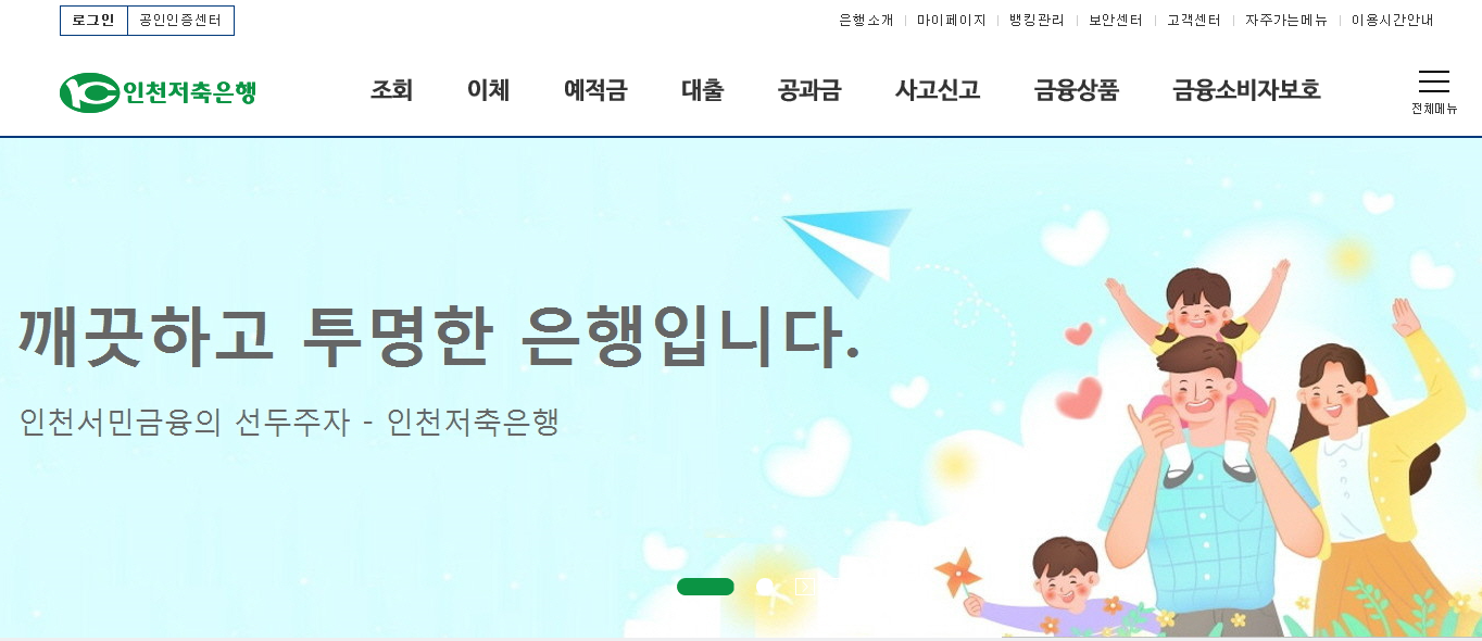 인천저축은행 사이트로 접속하면 아래처럼 메인화면이 보이는데 여기서 화면 상단 좌측에 있는 공인인증센터 메뉴 버튼을 눌러서 들어갑니다.