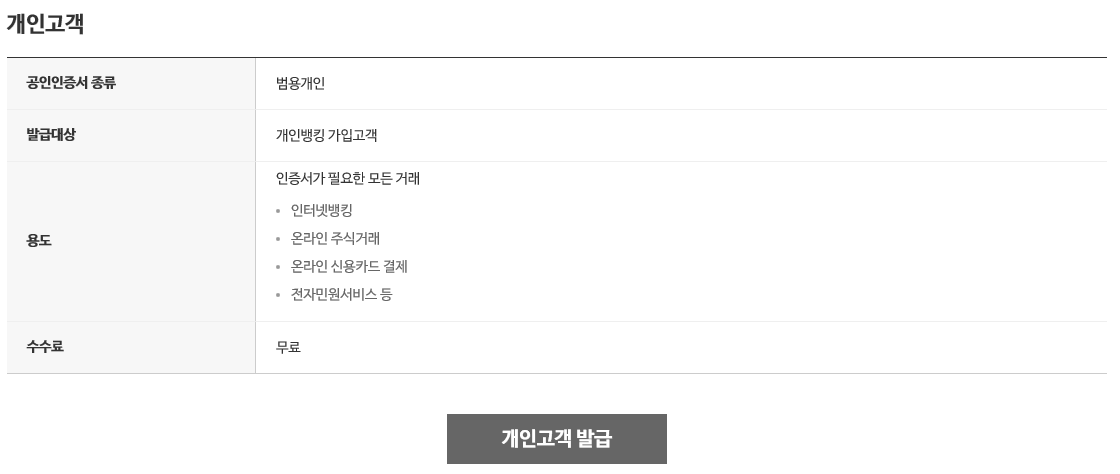 공인인증서로 로그인이 안된 상태이기 때문에 범용공인인증서 발급에 대한 화면이 나오고 개인고객이시라면 개인고객 발급 버튼을 눌러줍니다. 수수료는 무료라고 나와있네요.