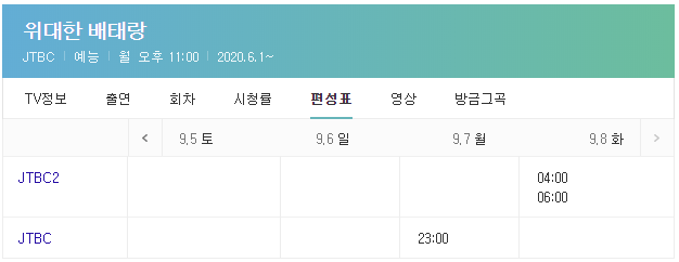 다시보기 방법 말고도 편성표상으로 재방송 시간을 맞춰서 보는 방법도 있습니다. 매주 월요일 밤11시가 정규 방송 편성시간이므로 위대한 배태랑 편성표로 검색했을 때 월요일 말고 다른 날짜에 방송하는 시간을 보시면 해당 시간에 재방송을 한다고 보시면 되겠죠.