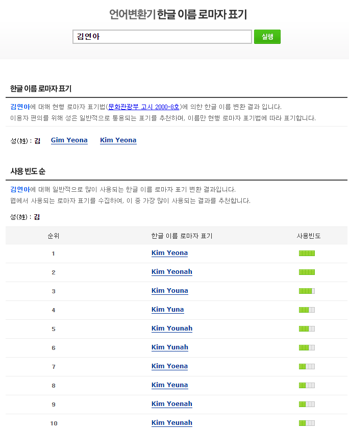 지금은 검색 사이트에서 영문이름 변환이라고 검색하시면 바로 결과 상단에서 한글 이름 입력만으로 간단하게 영문이름 변환을 해주는 기능을 제공하고 있습니다.
