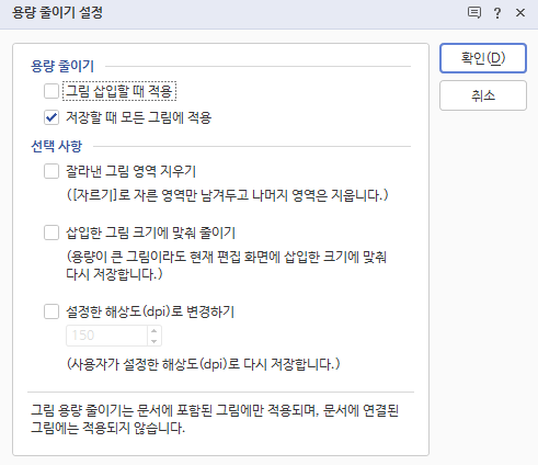 이 곳 설정을 통해서 사진용량을 줄이고 결과적으로 한글파일 용량을 줄일 수가 있습니다. 사진을 첨부할 때 압축하여 용량을 줄일 수도 있고 마지막 저장할 때 한꺼번에 모든 그림에 용량줄이기를 일괄 적용할 수도 있습니다.