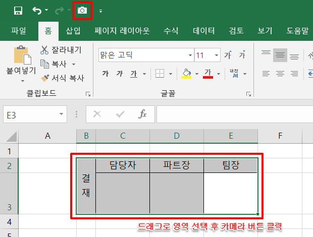 ▲ 이제 이 카메라 기능을 이용해서 결재란을 만들어 볼 차례입니다. 먼저 만들고 있던 기안서나 업무일지 등의 시트가 아닌 새 문서나 새 시트에서 원하는 모양의 결재란을 만들어줍니다. 그리고 이 결재란을 마우스로 드래그한 뒤 방금 만든 카메라 버튼을 클릭해줍니다.